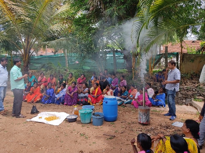 The “Akkadi Saalu” training program was launched as a state-wide initiative to revitalize interest in this indigenous cereal. Spearheaded by RRAN Karnataka, and supported by civil society partners and the India Biochar and Bioresources Network, the initiative included a series of two-day field sessions. These sessions covered key topics such as biochar-based crop residue management, use of bio-inputs for soil health, and natural pest control strategies. These trainings were conducted in partnership with leading CSOs and tailored for the local farming community.